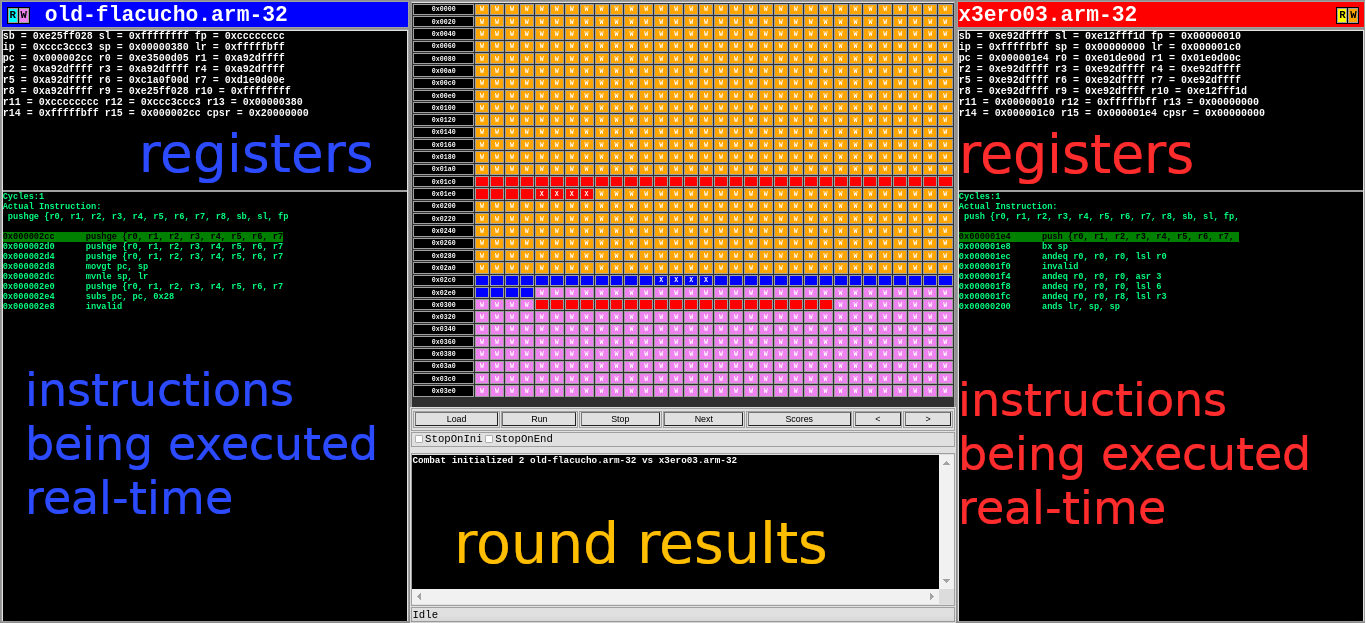 So as you can see above, the coloured (yellow, red, blue, pink etc…) region in the middle is a pictorial representation of memory region allocated to the two bots. In the image you can see that almost every thing is open source here. You can see the god damn assembly instructions of each bot in there! Which means you can reverse the bot by just looking at the match! Here X3eRo0’s bot is competing against a bot named old-flacucho. This bot was reversed by X3eRo0 after day1’s match. Blue means the executable code for left bot and Red means the executable code for right bot. Also the |R|W| colors shown beside the name of each bot is the colour of read and written memory for each bot. So, for eg: orange coloured memory region is written by X3eRo0’s bot and the region in pink is written by old-flacucho.