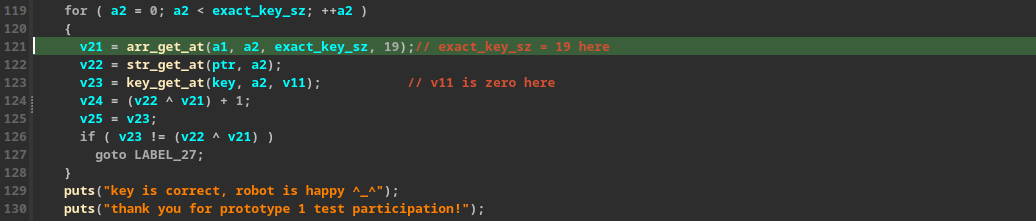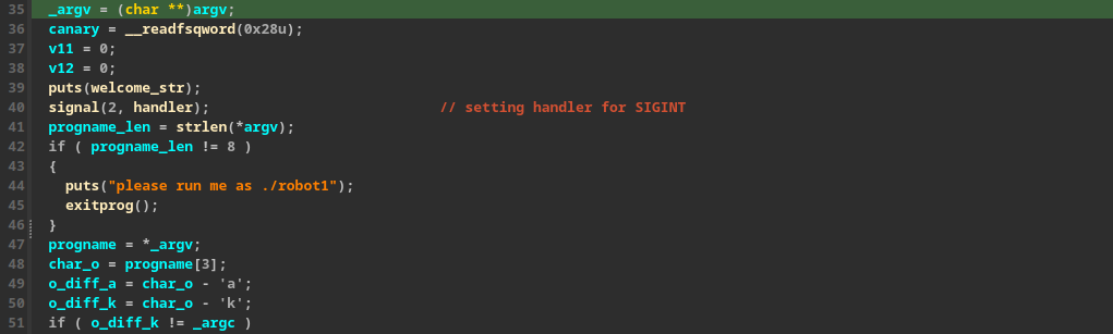 In the very beginning it’s checking if you’re running the program as ./robot1 or not. Then it gets the fourth charcter from program name ("./robot") and takes differences with ‘a’ and ‘k’.