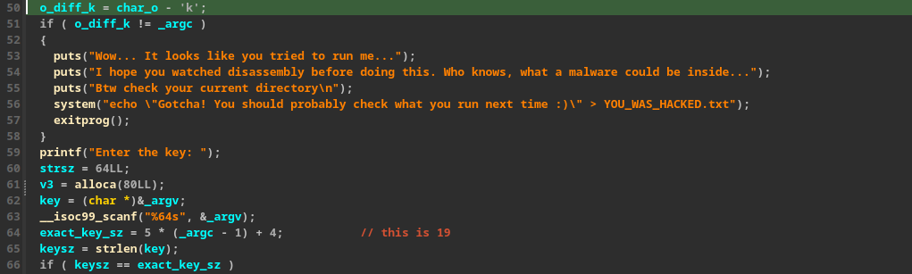 A check is made then whether argc == 4 or not. Note that difference of ‘o’ and ‘k’ is 4 in ASCII. If argc is not exactly 4 then the program will exit printing that message we saw in the beginning. Let’s run the program with 4 arguments then.