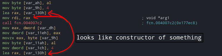 Looks like it’s memsetting a huge array (0x118 bytes) to 0. So, we don’t get any idea of what it is. But since this is the only constructor and is called in the initialization stage, most probably it’s either building a context data structure or something similar to CPU. A context data structure will contain everything important for current execution, eg : handle to bytecode file, bytecode buffer in memory, cpu that’ll execute the bytecode. Don’t mind that for now as we’ll see how it’s being used (i.e if it’s being used). We’ll name that variable as ctx and continue.
