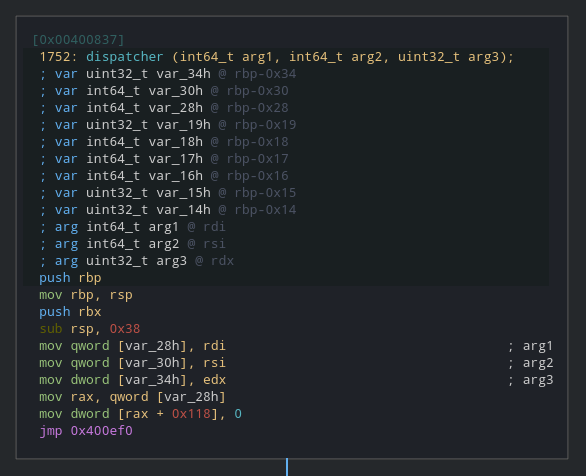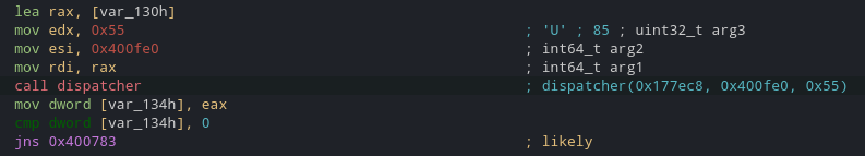 Now we can go to main and look where this function is being called and then analyze what’s being passed to this. We’ll try to do as less reversing as possible in functions outside this one. I’ll name this function to dispatcher to increase readability.