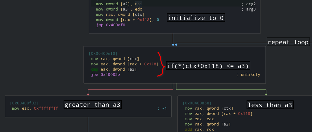 If you take a high level view, this is the basic working condition for the FeDeX loop. This means this can be either a normal iterator or a program counter or something similar. Let’s keep an eye on that variable too. If this field is being increased again and again in before some conditional jumps then it must be the program counter. Let’s confirm that suspicion first. Scroll through the graph and check when and how it’s being altered.